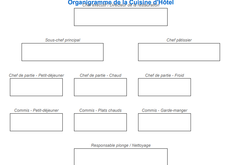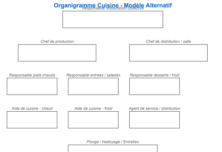 Ce modèle est volontairement vierge pour être personnalisé selon la réalité du site : certains établissements auront des fonctions fusionnées, d’autres intégreront des postes spécifiques (nutritionniste, diététicien, gestionnaire de stock…).