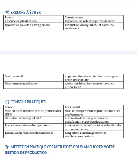 Après avoir abordé des concepts essentiels tels que le taux de rendement, le coût de revient et la gestion des stocks, nous allons poursuivre avec 5 exercices avancés supplémentaires axés sur l’optimisation des flux, la gestion des capacités et la planification industrielle.