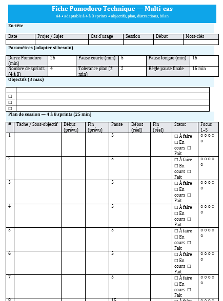 Fiche A4 “Pomodoro Technique — Multi-cas”
