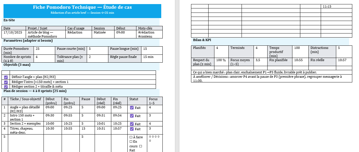 Quatre sprints de 25 minutes, trois objectifs clairs, un journal des distractions et un bilan. Ci-dessous, 11 cas pratiques prêts à l’emploi pour transformer la fiche en résultats visibles.