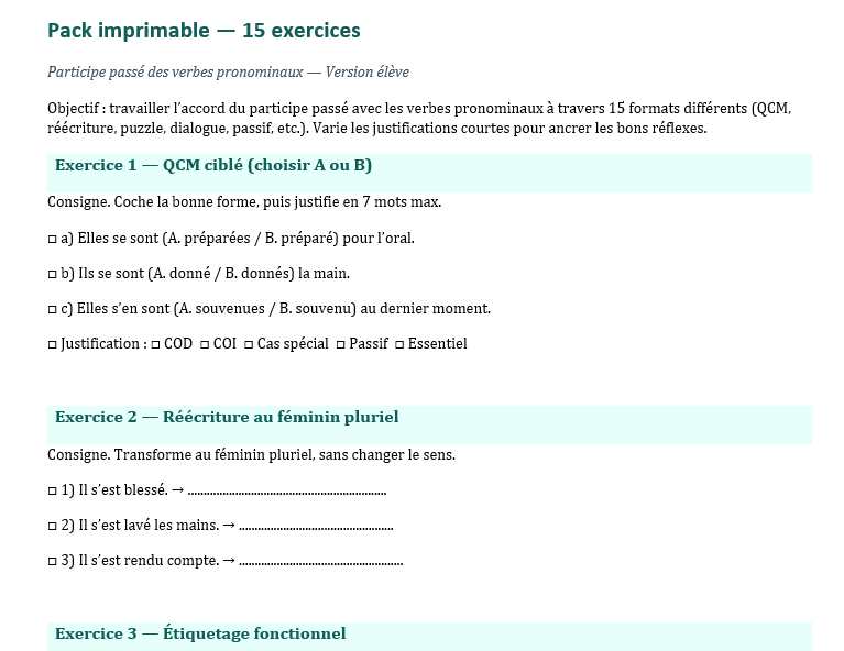 La promesse est simple : transformer un chapitre réputé piégeux en suite de réflexes stables. Les 15 exercices ne se ressemblent ni dans le fond ni dans la forme : QCM, réécriture, dictée guidée, transformation en relatif, légende d’image, mini-dialogue, puzzle de segments, classement thématique, “intrus” à débusquer, production libre contrôlée… Chaque item installe une micro-compétence (repérer la fonction de se, détecter un COD antéposé, reconnaître un cas spécial), puis la consolide par une justification courte et humaine.