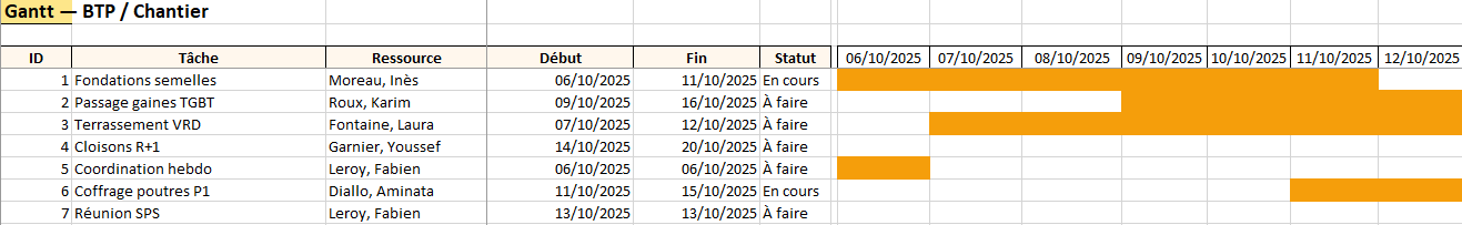 • ID | Tâche | Ressource | Chantier/Site | Début | Fin | Charge (h) | Priorité | Statut | Durée (j) | Charge/jour (h) (auto)
