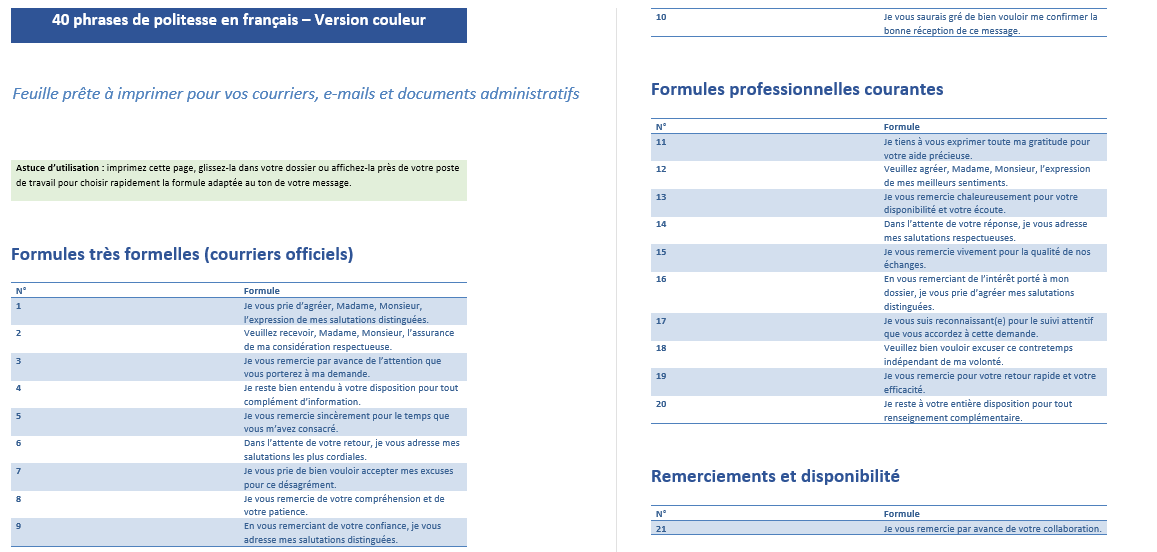 Un modèle rassemblant 40 phrases de politesse prêtes à l’emploi n’est donc pas un gadget : c’est un véritable aide-mémoire pour gagner du temps, éviter les maladresses et ajuster le niveau de langage à chaque contexte (administration, entreprise, école, association, etc.).