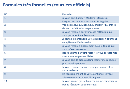 Ce sont les tournures que l’on utilise pour un courrier officiel, une lettre adressée à une institution, à un supérieur hiérarchique éloigné ou à un partenaire avec lequel la relation est très protocolaire.