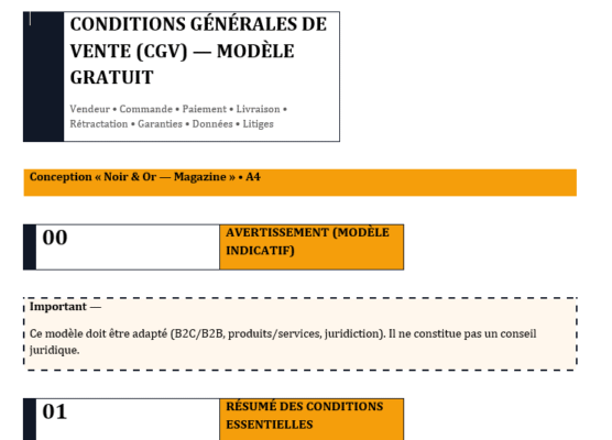 À l’impression, elle tient sur une page, en noir/graphite très lisible, avec un tracé régulier des tableaux. C’est votre couteau suisse pour démarrer vite sans renoncer aux bases (calculs fiables, validations de saisie, QR texte standardisé).