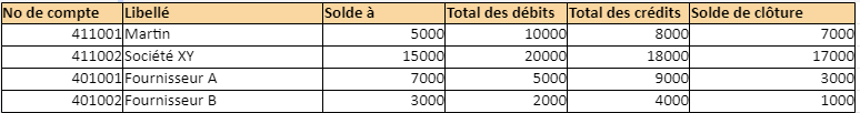 La balance auxiliaire se présente sous la forme d’un tableau avec les éléments suivants pour chaque compte de tiers :
