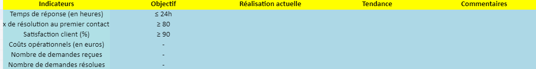 - Objectif : Objectif que vous souhaitez atteindre pour chaque indicateur. Cela peut se base sur des normes de l’industrie, des objectifs internes ou des niveaux de service convenus avec les clients.