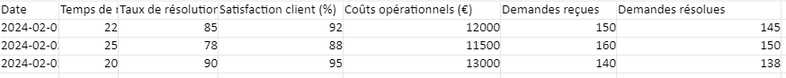 - Taux de résolution : [Calculer le pourcentage de demandes résolues par rapport au nombre total de demandes]