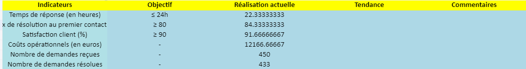 - Tendance : Indiquez la tendance actuelle des performances de votre SAV pour chaque indicateur. Est-ce que les performances s’améliorent, restent stables ou se détériorent ? Cela peut être une évaluation qualitative ou quantitative.