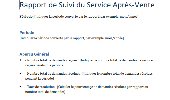 - Indicateurs : Liste des indicateurs clés que vous souhaitez suivre dans votre service après-vente, tels que le temps de réponse, le taux de résolution au premier contact, la satisfaction client, les coûts opérationnels, etc.