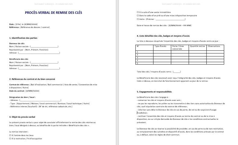 Un procès-verbal de remise des clés doit contenir des informations précises et détaillées sur la transaction. Voici les éléments clés à inclure dans ce document :