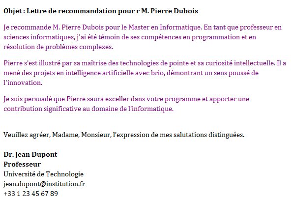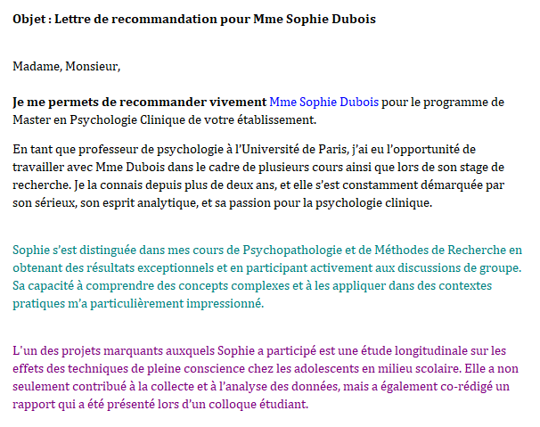 Cet exemple met en avant les compétences académiques, les qualités interpersonnelles et les expériences pertinentes de Sophie Dubois, tout en présentant une recommandation solide et détaillée.
