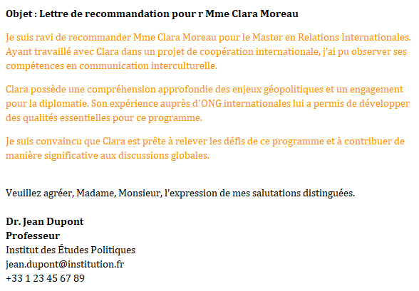 Voici un exemple complet de lettre de recommandation pour un programme de Master :