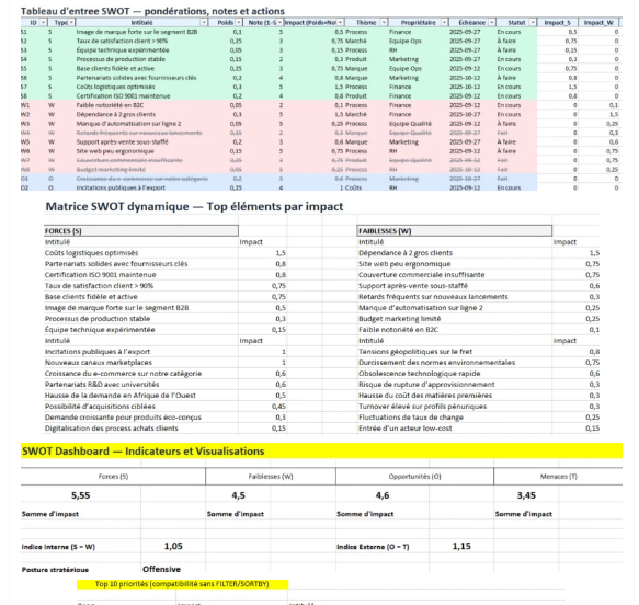 - Colonnes pour remplir les éléments SWOT (Forces, Faiblesses, Opportunités, Menaces).