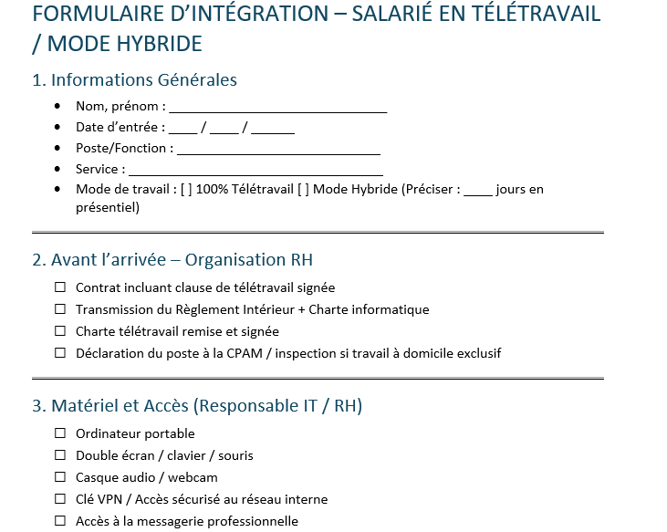 Ce formulaire est destiné à garantir une intégration optimale des salariés en télétravail ou en mode hybride, en assurant un cadre de travail sécurisé, conforme et inclusif. Il formalise les étapes de préparation, d’accueil, de dotation matérielle, d’inclusion, de suivi managérial et de conformité réglementaire.