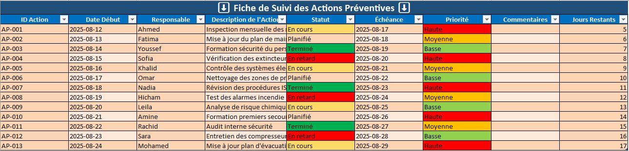 Le fichier contient une feuille unique intitulée Suivi Actions Préventives, pensée pour suivre toutes les actions destinées à éviter la survenue d’incidents, pannes ou non-conformités.