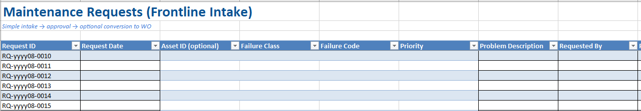 - Consider a simple macro or Power Query to automate Request → WO conversion and monthly KPI exports.