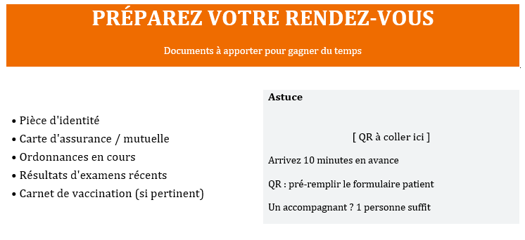 - Paiement & tiers payant : “Ce que nous acceptons / Ce qu’il faut apporter”.