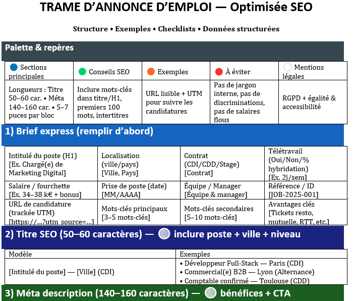 - SEO : mot-clé dans le titre et l’intro, intertitres descriptifs, version courte pour jobboards, JSON-LD JobPosting.