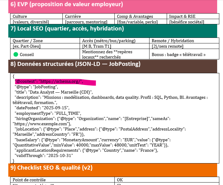 - Données structurées JSON-LD / JobPosting (bloc prêt à adapter).
