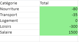 - Feuille « Rapports » : Cette feuille est préparée pour afficher les totaux par catégorie grâce à des formules pré-installées qui calculent automatiquement le total dépensé ou reçu pour chaque catégorie listée dans la feuille « Catégories ». Les totaux sont mis en évidence avec un fond vert pour une visualisation et une analyse faciles.