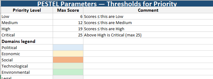• Priority Level : calcul via seuils de PESTEL_Params.