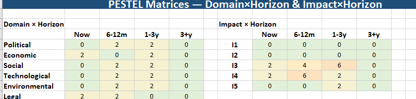 Classeur Excel prêt à l’emploi pour analyser l’environnement Politique, Économique, Social, Technologique, Environnemental et Légal — avec automatisations, couleurs, matrices et dashboard. Les formules sont en anglais (compatibilité) et les dates au format yyyy-mm-dd.
