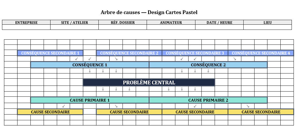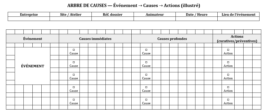 L’arbre de causes représente graphiquement les liens de causalité entre un événement (panne, quasi-accident, non-conformité, défaut qualité) et les faits qui l’ont rendu possible. On y trace des flèches, on distingue les liens “ET/OU”, on annote les preuves.