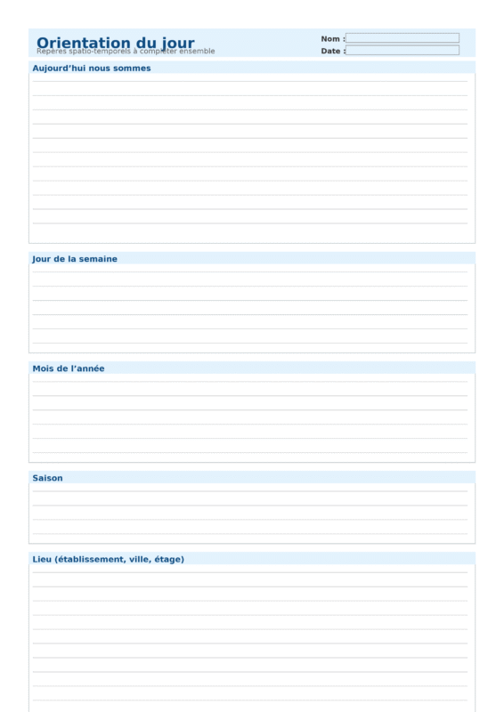 La fiche propose une mise au point douce sur le jour, le mois, la saison, le lieu, l’étage et la météo. L’animateur lit la consigne, invite à pointer et à verbaliser, puis coche avec la personne. Ce temps d’orientation stabilise le groupe, relance la conversation et facilite l’entrée dans les exercices cognitifs qui suivent.