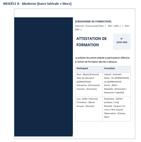 L’approche la plus robuste, dans un contexte professionnel, consiste à avoir un modèle d’attestation (pour l’apprenant) et, si vous êtes dans une logique de financement/justificatifs, un certificat de réalisation conforme au modèle ministériel.