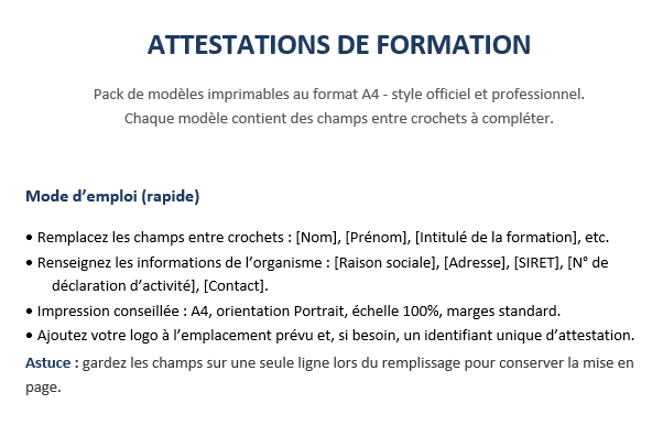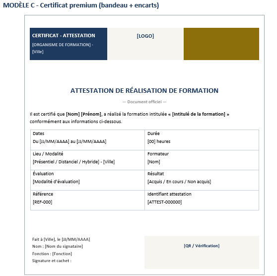 - Formation financée / contrôlable : produire aussi un certificat de réalisation conforme au modèle ministère.