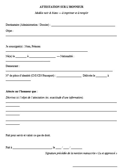 L’attestation sur l’honneur est une déclaration écrite et signée par laquelle une personne affirme la véracité d’un fait (hébergement, résidence, situation familiale, absence de condamnation, etc.). C’est un document simple, souvent exigé “sur papier libre”, mais engageant : une fausse déclaration peut être sanctionnée.