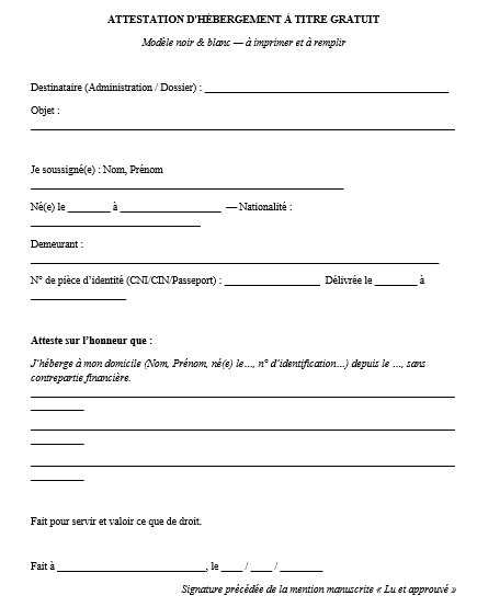 “J’héberge à mon domicile [Nom, Prénom, né(e) le …], sis [adresse complète], depuis le [date], à titre gratuit et sans contrepartie financière.” - Résidence habituelle :