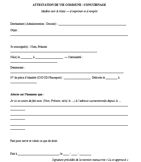Document calibré pour attester d’une union de fait : identité des deux partenaires, adresse partagée et ancienneté de la vie commune. Le texte vise la sobriété factuelle (pas d’effusion, pas d’arguments) mais laisse assez d’espace pour préciser le contexte (bail commun, charges partagées, enfants à charge le cas échéant).