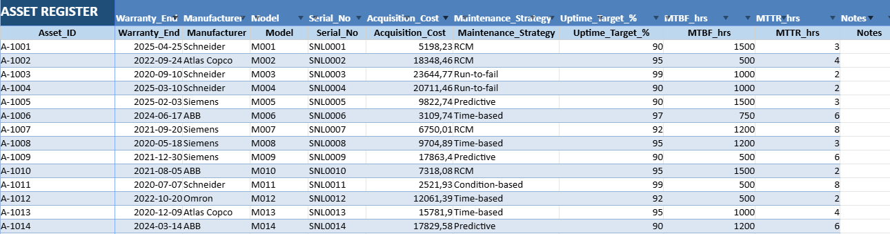 - Columns: Asset_ID, Asset_Name, Category, Location, Criticality (1–5), Condition, Install Date, Warranty End, Manufacturer, Model, Serial No, Acquisition Cost, Maintenance Strategy, Uptime Target %, MTBF, MTTR, Notes.