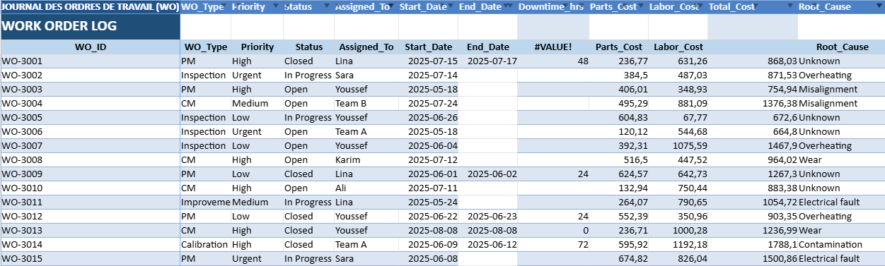 - Fields: WO ID, Dates (Opened, Start, End), Type, Priority, Status, Assigned To, Downtime (hrs), Parts Cost, Labor Cost, Total Cost, Root Cause.
