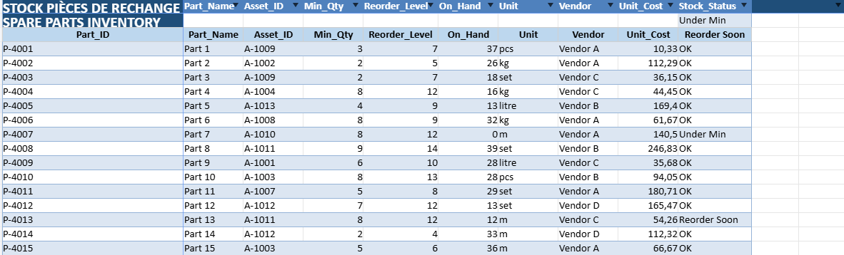 - Columns: Part_ID, Part_Name, Asset_ID, Min_Qty, Reorder_Level, On_Hand, Unit, Vendor, Unit_Cost, Stock_Status (auto).