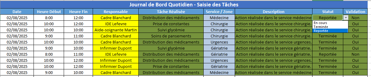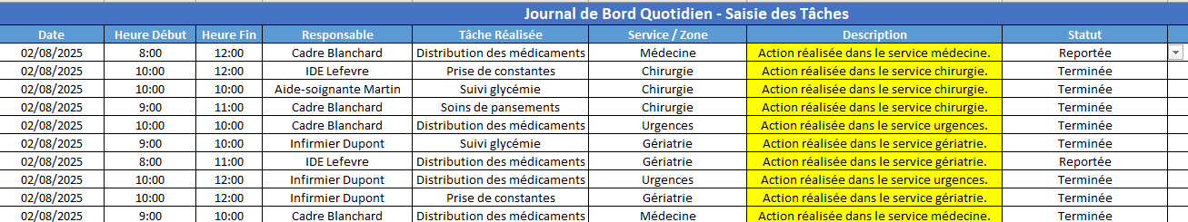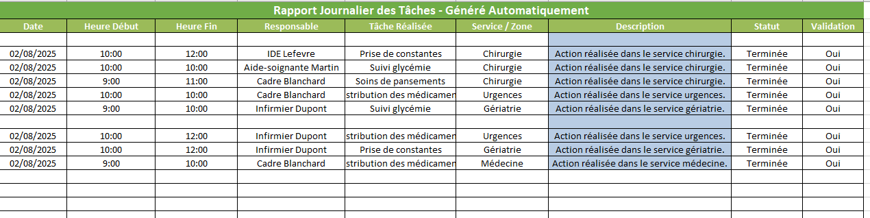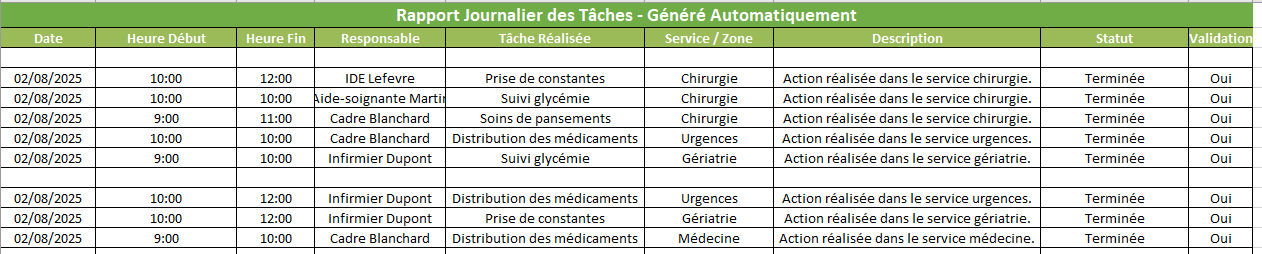 Ce fichier Excel est un modèle structuré et automatisé destiné à produire un rapport journalier des tâches opérationnelles, principalement pour un usage professionnel dans les environnements soignants, logistiques ou techniques.