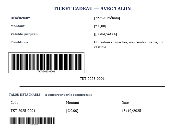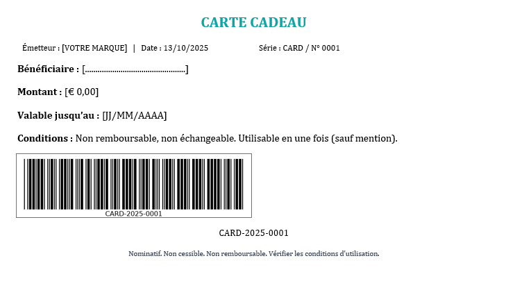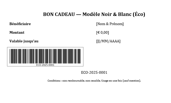 • Carte cadeau (A4 ou 4 par page) : design simple, champs visibles, espace pour code-barres.