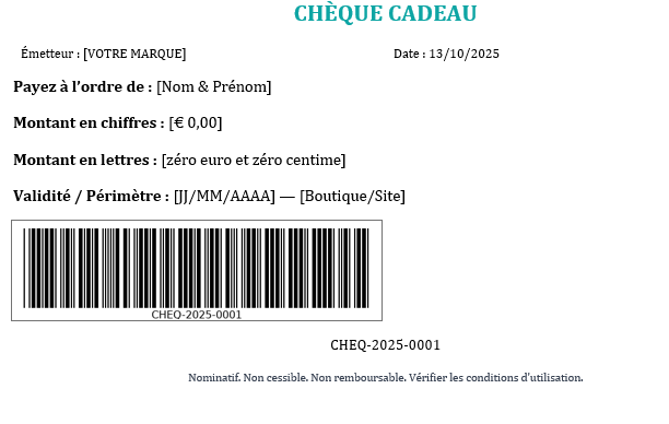 • Chèque cadeau : style “formulaire”, ligne “Montant en lettres”, espace signature.