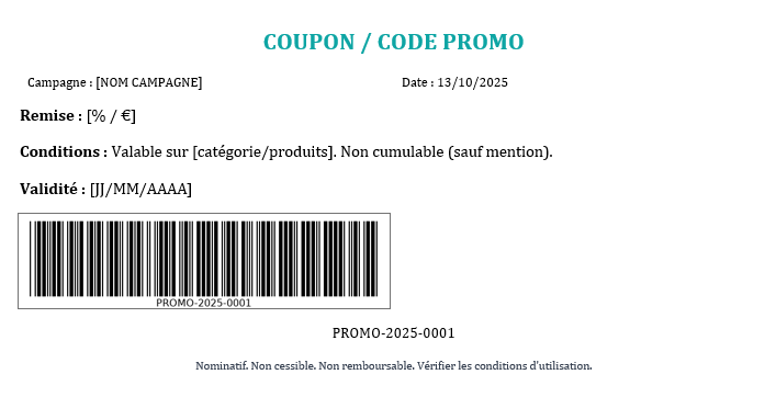 • Validité raisonnable : évitez des durées trop courtes ; indiquez clairement les exclusions (soldes, catégories).