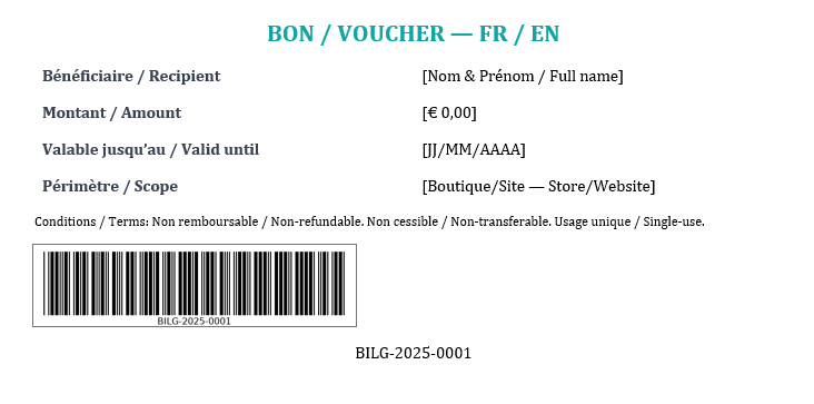 L’opérationnel qui fait la différence. Côté document, quelques constantes : un montant en chiffres et en lettres (pour lever l’ambiguïté), un code en clair sous le visuel scannable, des conditions courtes (non cessible, non remboursable, usage unique sauf mention), un contact support discret mais visible. Côté process, un registre à jour (émis/utilisé/annulé), des tests avant diffusion (magasin et checkout), et des rappels d’échéance J-30/J-7.