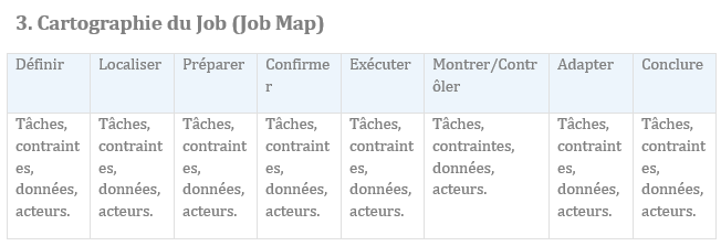 - Job Map (8 étapes) : Définir → Localiser → Préparer → Confirmer → Exécuter → Monitorer → Modifier → Finaliser. On repère les frictions et cadre les opportunités.