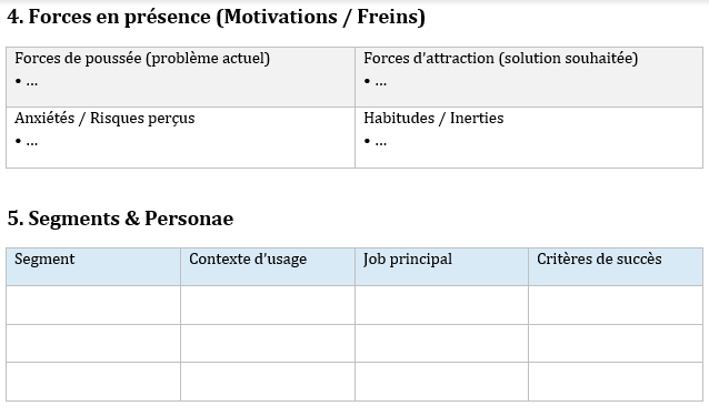 - Ouvrez le Brief JTBD (Word) : remplissez sections 1→10 en vous appuyant sur les ateliers/entretiens.