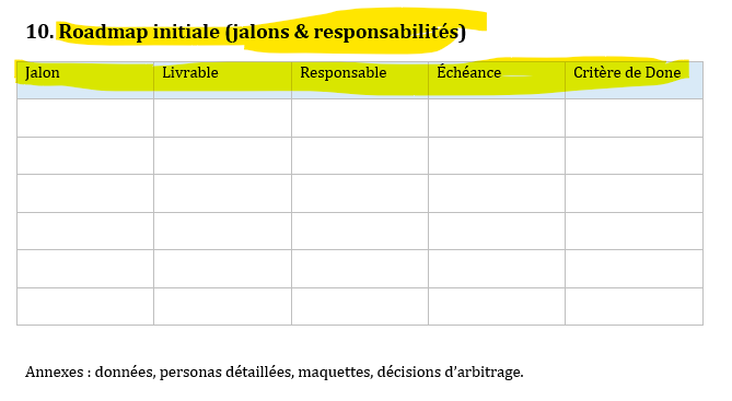 - Outcomes flous (“mieux piloter”) → ✅ verbe + objet + métrique.