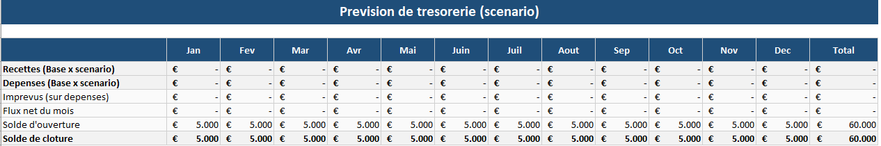 - un taux d’imprévus (par exemple 5 % ou 8 % des dépenses) pour absorber les variations ;