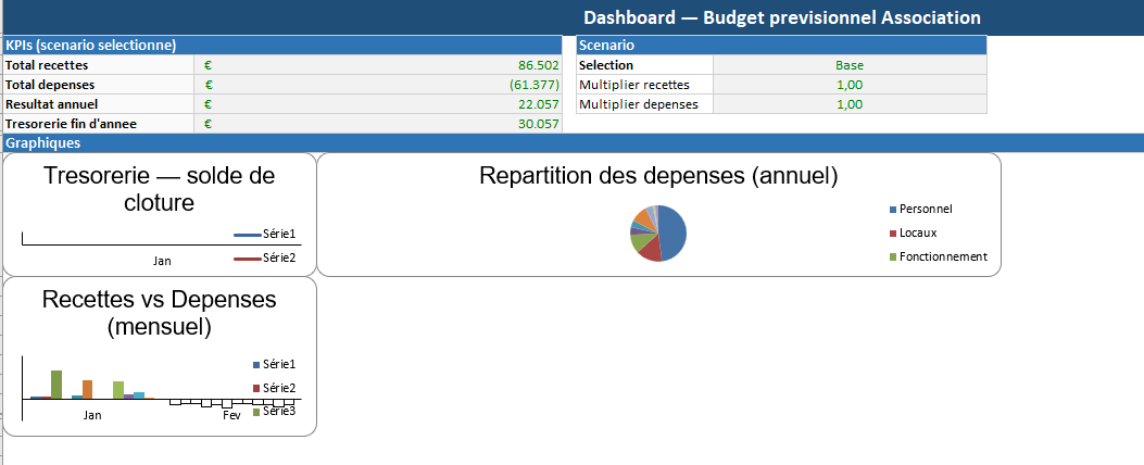 Un classeur de pilotage budgétaire qui permet de prévoir, structurer, visualiser et suivre les finances d’une association sur 12 mois, avec une logique de trésorerie et des indicateurs lisibles.