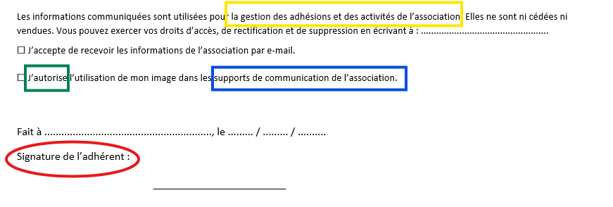 Enfin, le dernier bloc rappelle les règles de traitement des données personnelles et propose deux cases distinctes : une pour accepter de recevoir les informations de l’association par e-mail, une autre pour autoriser l’utilisation de l’image dans les supports de communication. La conclusion se fait de manière classique, avec un espace pour la date, le lieu et la signature de l’adhérent.