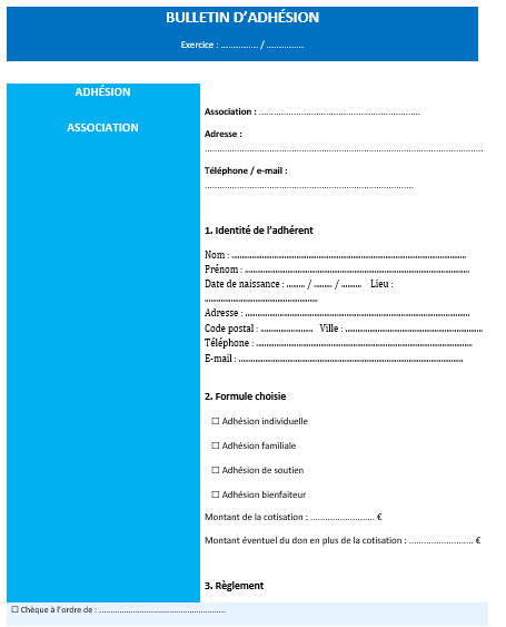- un bandeau titre en haut de page, sur fond bleu, avec le titre « BULLETIN D’ADHÉSION » et la mention de l’exercice concerné ;