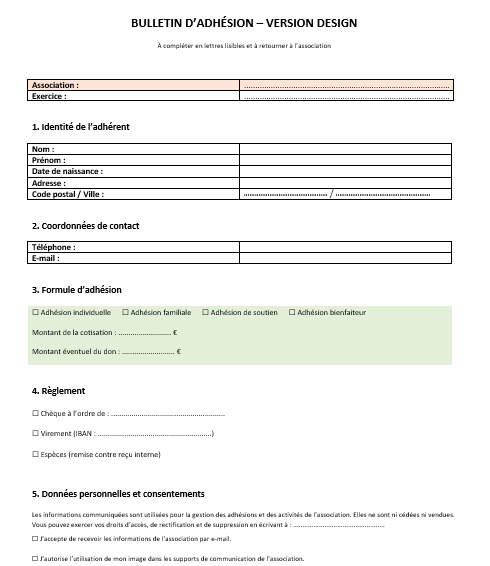 - un titre central « BULLETIN D’ADHÉSION – VERSION DESIGN » accompagné d’un sous-titre invitant à compléter le document lisiblement ;